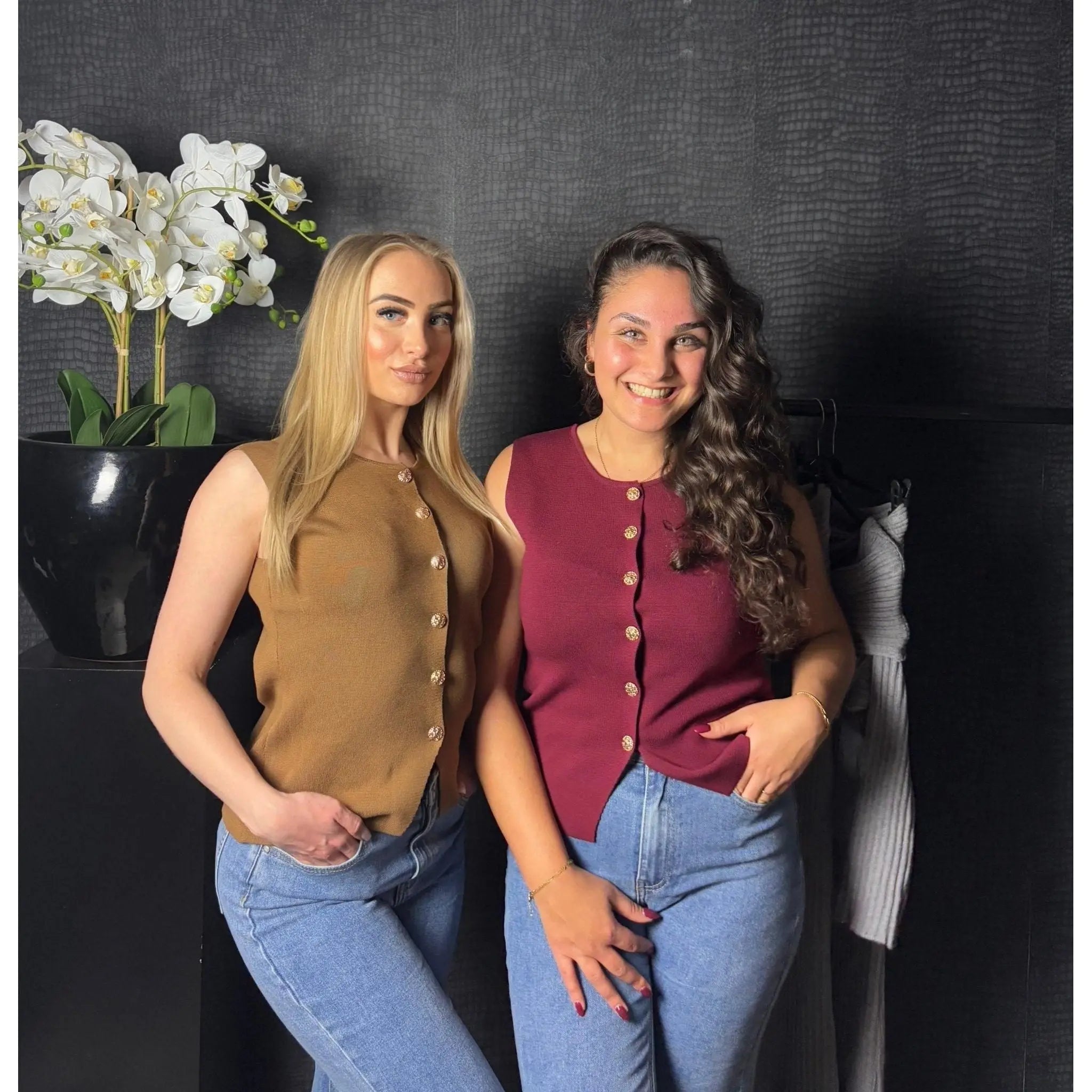 Deze top met gouden knopen in bruin is een stijlvolle en verfijnde keuze voor elke gelegenheid. Het elegante ontwerp, gecombineerd met de gouden knopen, voegt een luxe uitstraling toe aan je outfit. Het ademende materiaal en de comfortabele pasvorm maken het een ideale top voor zowel casual als chique looks.